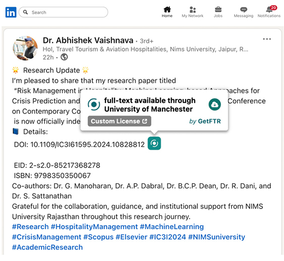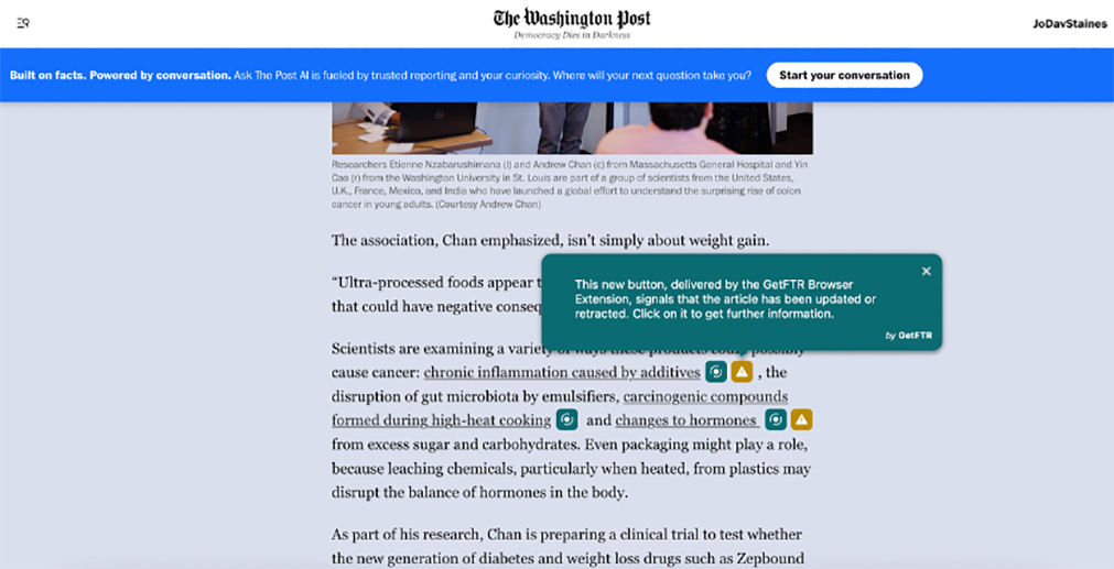 The extension adds GetFTR buttons to AI research tools where an article can be identified and the researcher has access through an institution subscription or open access. Researchers who have downloaded the Browser Extension will see GetFTR buttons appear in Claude, ChatGPT, Google Scholar Labs AI tool, and more providing links to trusted sources and flagging retractions and updates. This ensures researchers can easily access the trusted full text without relying on the summary provided by the AI tool, giving both publishers and researchers confidence that the correct version of content is signposted at the point of discovery.